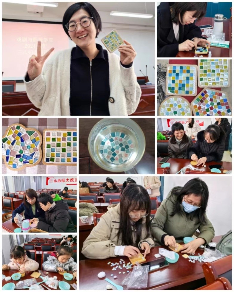 活动伊始,老师们各自挑选了喜爱的杯垫材料包,认真制作起来。DIY杯垫活动中老师们各自发挥聪明才智,将手中的马赛克方块按照形状和颜色精心排布在木质杯垫托上,形成了风格多样的杯垫款式。然后再将石膏粉加水调成糊状,老师们互相帮助加水调匀。最后再将半干的石膏粉小心翼翼地擦除,一个个造型精美的杯垫就制作完成了。活动结束后,工会还发放了洗衣液等节日慰问礼品。