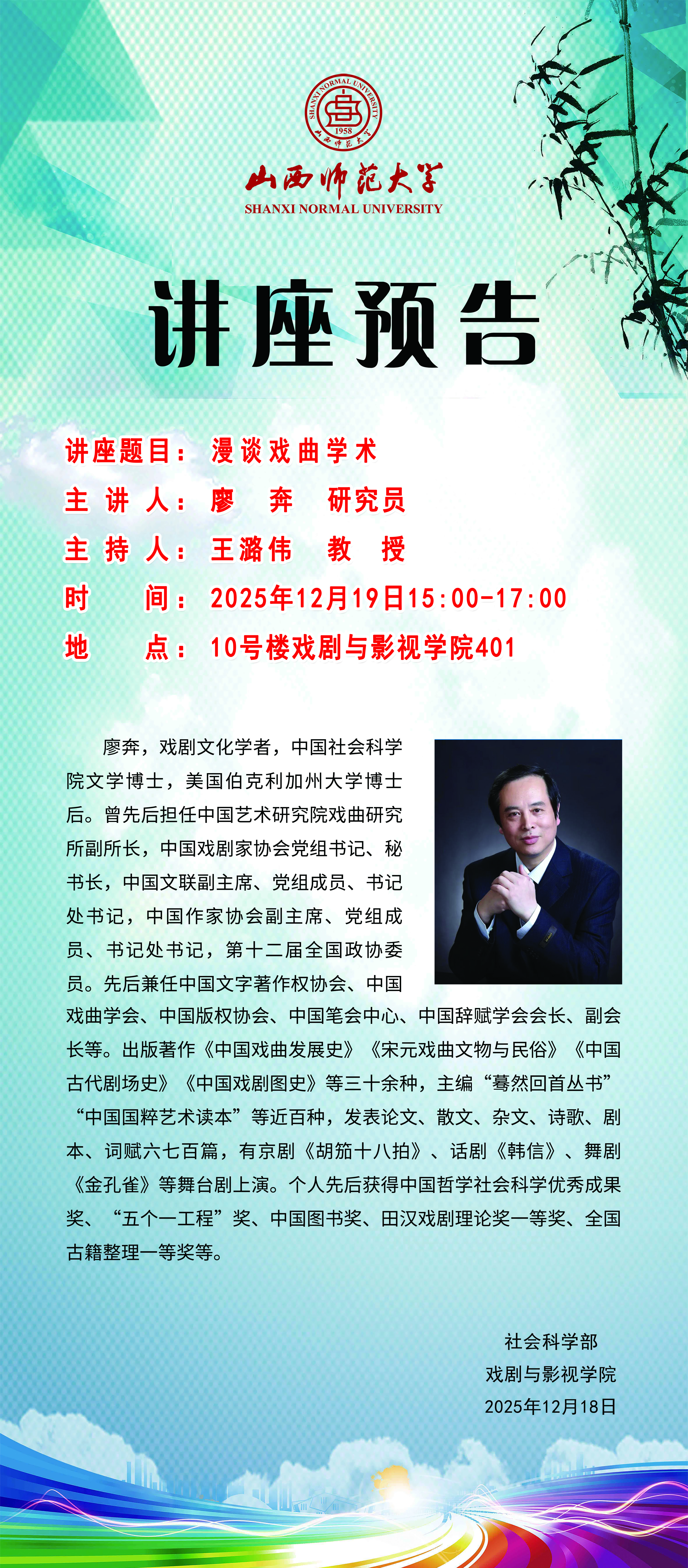 成人自拍 拟于12月19日(周五)下午15:00-17:00在南区10号楼401会议室举办《漫谈戏曲艺术》讲座,主讲人为廖奔研究员,本次讲座由王潞伟教授主持。