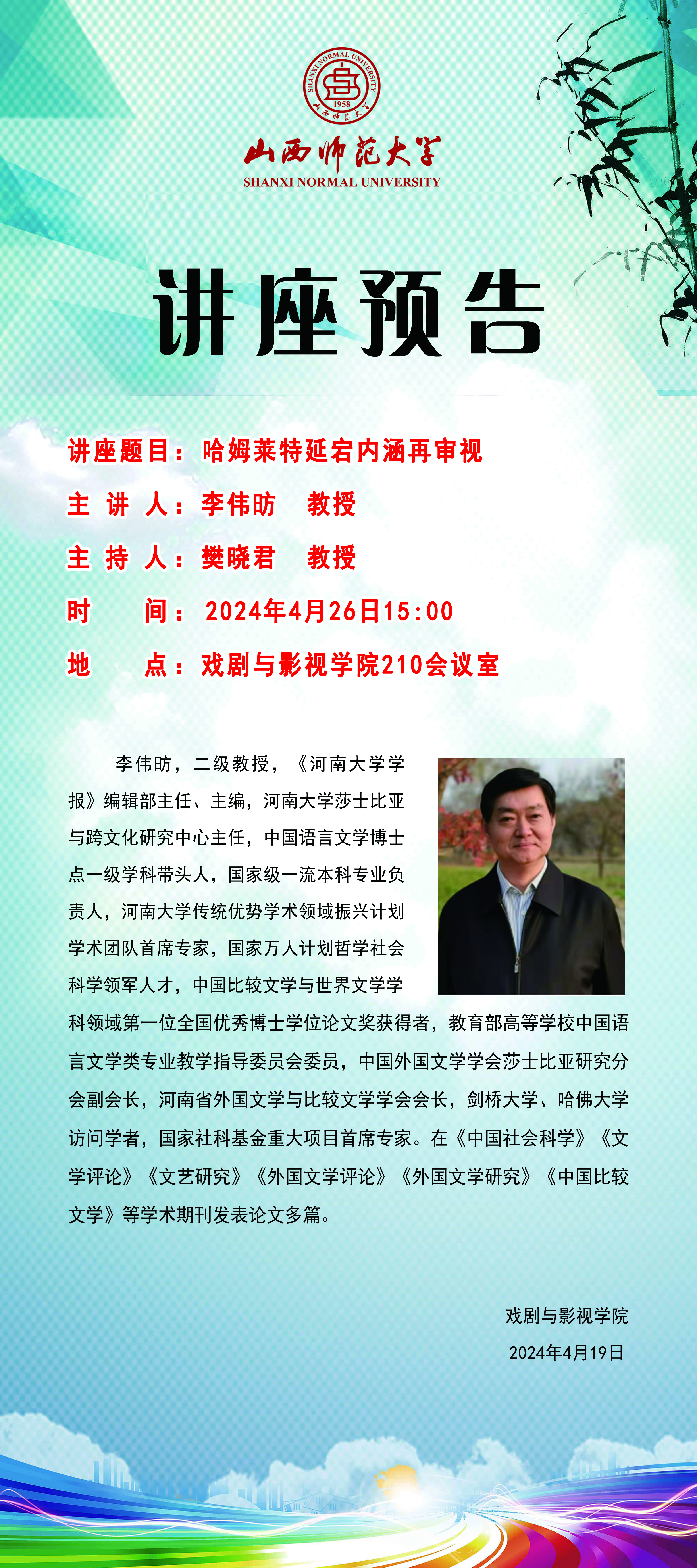 成人自拍 拟于2024年4月26日15:00在210会议室举办《哈姆莱特延宕内涵再审视》讲座,主讲人为河南大学李伟昉教授。