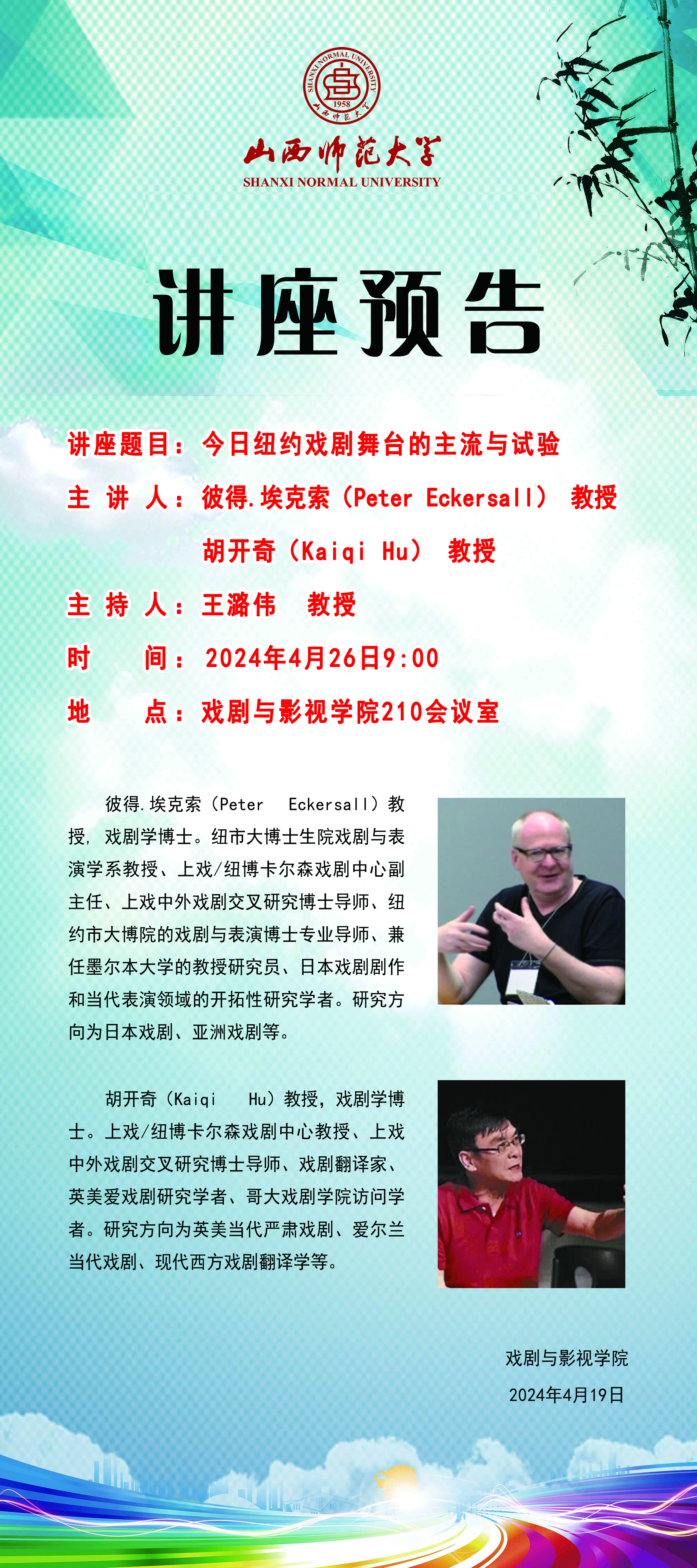 成人自拍 拟于2024年4月26日9:00在学院210会议室举办《今日纽约戏剧舞台的主流与试验》讲座,主讲人为彼得·埃克索教授、胡开奇教授。