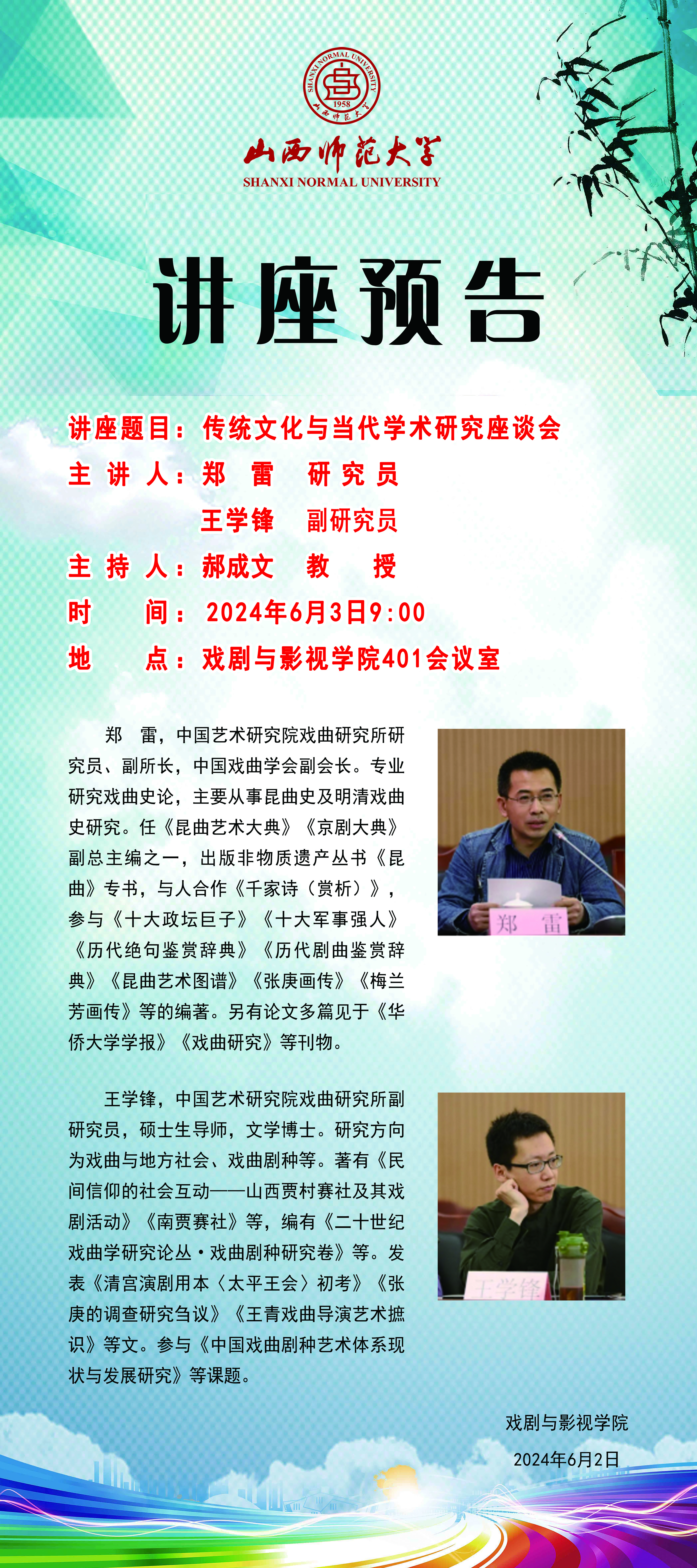 成人自拍 拟于2024年6月3日9:00在成人自拍 401会议室举办《传统文化与当代学术研究座谈会》专题讲座,主讲人为郑雷研究院、王学锋副研究员。