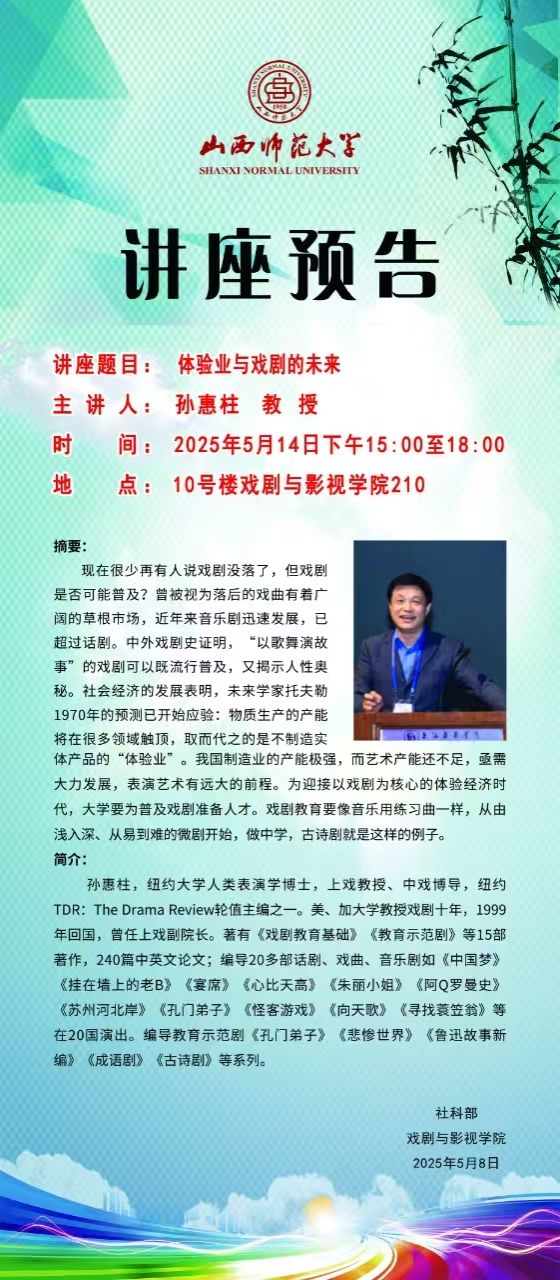 成人自拍 拟于5月14日(周三)15:00-18:00在南区10号楼401会议室举办《体验业与戏剧的未来》讲座,主讲人为孙惠柱教授。