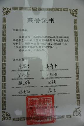 王潞伟博士在“第十届民间文化青年论坛奖”征文活动中提交的《民间礼乐思想的渗透与神庙剧场的普及——以上党地区神庙剧场为主要研究对象》一文,经过评审委员会严格评审获得“第十届民间文化青年论坛特别评审奖”。