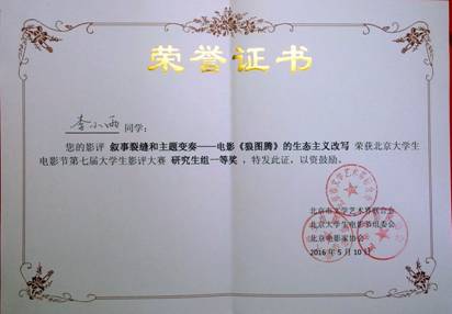 研究生李小雨的论文《叙事裂缝和主题变奏——电影<狼图腾>的生态主义改写》荣获本次大赛研究生组一等奖。