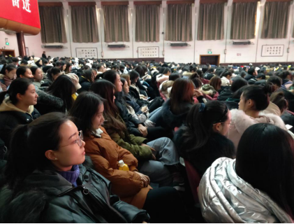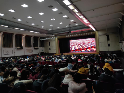 1801班、1803班、1701班全体同学在大礼堂收看大会直播