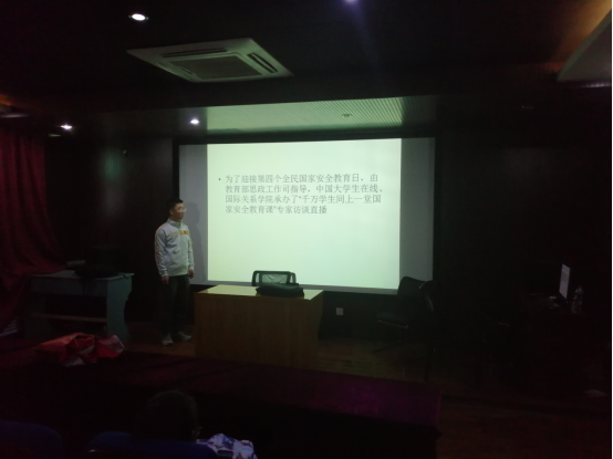 随后,同学们共同观看“千万学生同上一堂国家安全教育课”专家访谈直播。本次直播是为了迎接第四个全民国家安全教育日,由教育部思想政治工作司指导,中国大学生在线、国际关系学院所承办。