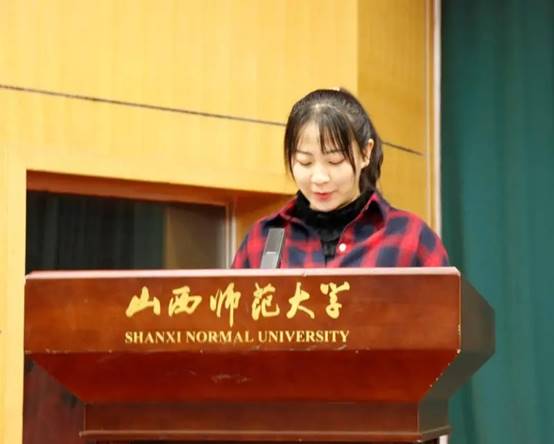 会议第六项,新生代表李璇同学讲话。她代表研一新生表达了对学院的感谢,提出自己的学习目标:好好深造,提高自身修养,承担起新时代青年的责任。