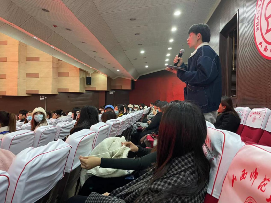 讲座开始,白老师以自己做的节目《擂响中华》的一期视频引出“审美的核心是艺术”这一观点,边播放视频边为大家讲解。白老师引用木心先生“没有审美力是绝症,知识也解决不了”这句话提出“审美缺失是绝症”“文盲固可怕,美盲更可怕”两个观点,他说:“文盲会让你对生活畏惧,但是美盲会让你对生活厌倦”,给大家阐明审美力的重要性。之后,白老师又例举了多位戏曲艺术家的真实案例,讲述了艺术与生活、审美与人性的内在联系,他说:“只要中国人在,人性在,戏曲就永远不会消亡。”根据这些观点,在座的同学们也向老师谈了自己的感受,并且提出自己的问题,与白老师进行了亲切的互动。最后,白老师希望大家活在当下,珍惜当下,因为“为人生目标奔波就是意义所在”。