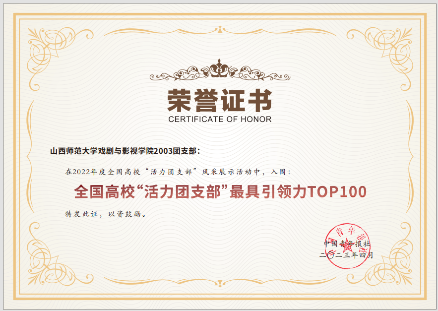 2003团支部创新开展学习教育,组织团员参加“戏影春秋,明德载道”道德讲堂、“忆苦思甜,重走长征路”长跑活动、世界戏剧日宣传、传唱红歌以及党史知识接力赛等活动,让支部的组织生活富有时代感和“青年味”。在弘扬和传承中华优秀传统文化过程中,支部成员展现了青年的责任和担当,组建了多支暑期“三下乡”社会实践队伍,扎根三晋大地开展非遗调研,收获了丰硕成果。在创新创业实践中,支部成员的《山西古代剧场与数字虚拟融合传播探索》获得国家级大学生创新创业训练计划项目,为传播传统文化贡献力量。
