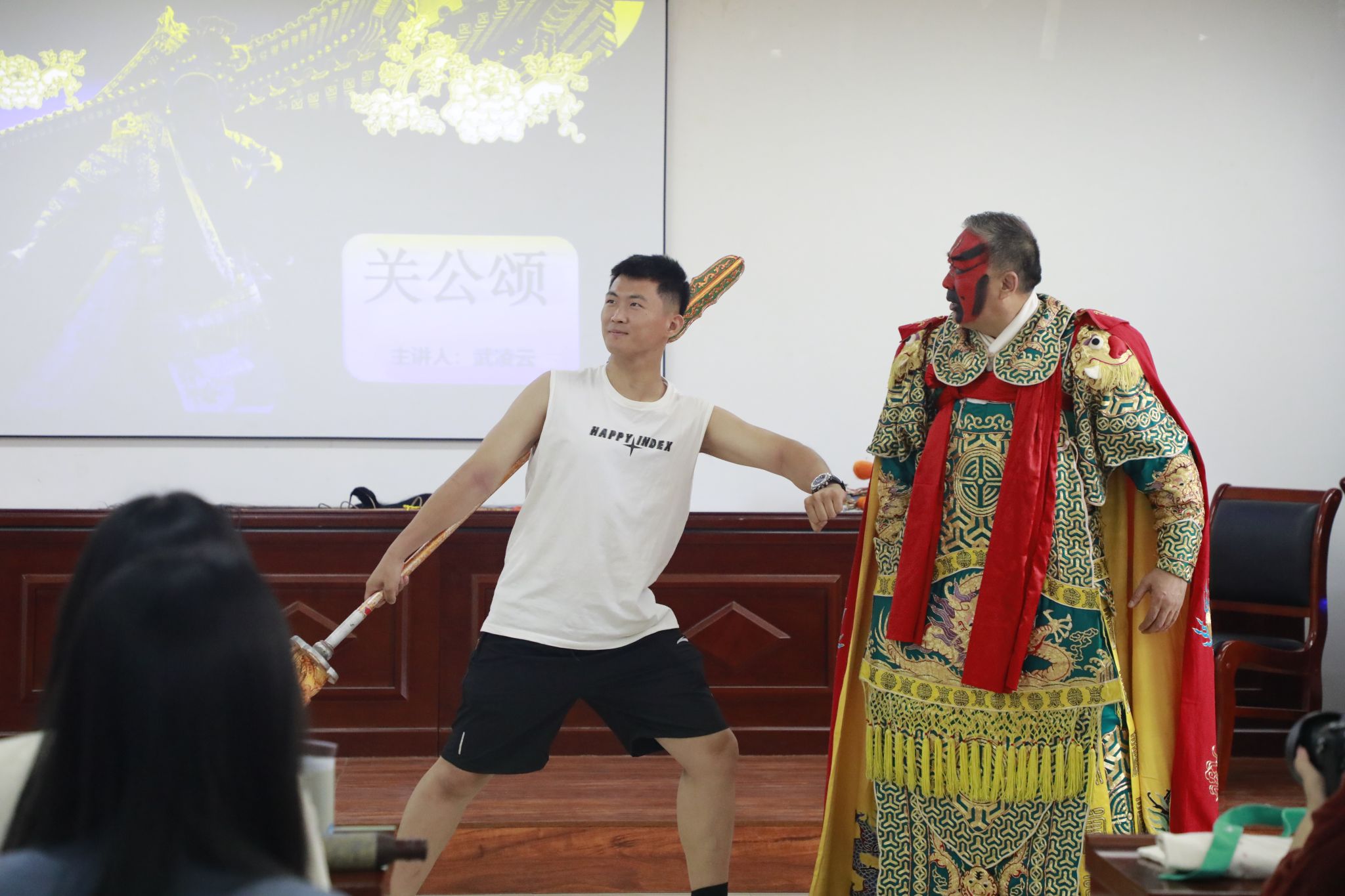 讲座上,师生们首先欣赏了武凌云的表演短片。紧接着武凌云表演了一段《走麦城》中的一段,生动地展现了关羽的英雄形象和忠义精神,给现场师生留下了深刻的印象,受到了现场老师和同学们热烈响应。紧接着,武凌云详细介绍了关羽在戏曲中的服饰、花脸以及专属道具。此外,他还深入阐述了关羽的忠孝仁义,强调关公精神就是忠于国家、忠于民族。同时,他分享了自己赴国外演出的经历,并表示戏曲演员走出国门代表的是中华民族,传播的是中国优秀的传统文化,作为一名扮演关公的戏曲演员,精气神至关重要,而更为关键的是要忠于祖国、热爱祖国。
