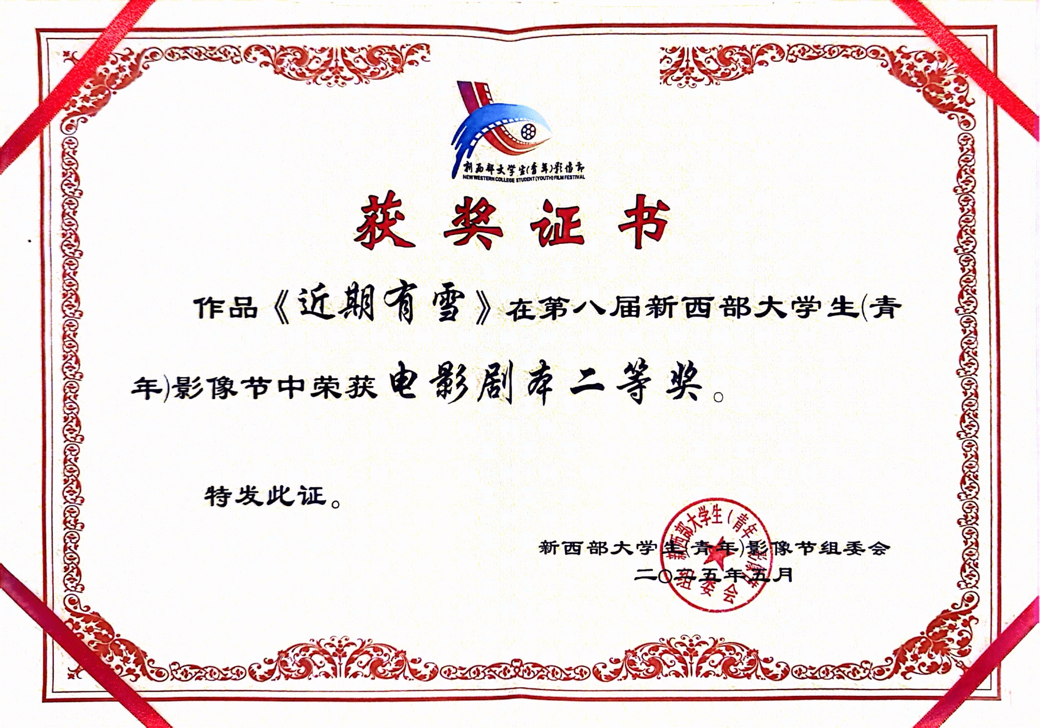 戏剧影视文学专业本科生白杰凭借电影剧本《近期有雪》斩获主竞赛单元—电影剧本类—二等奖。