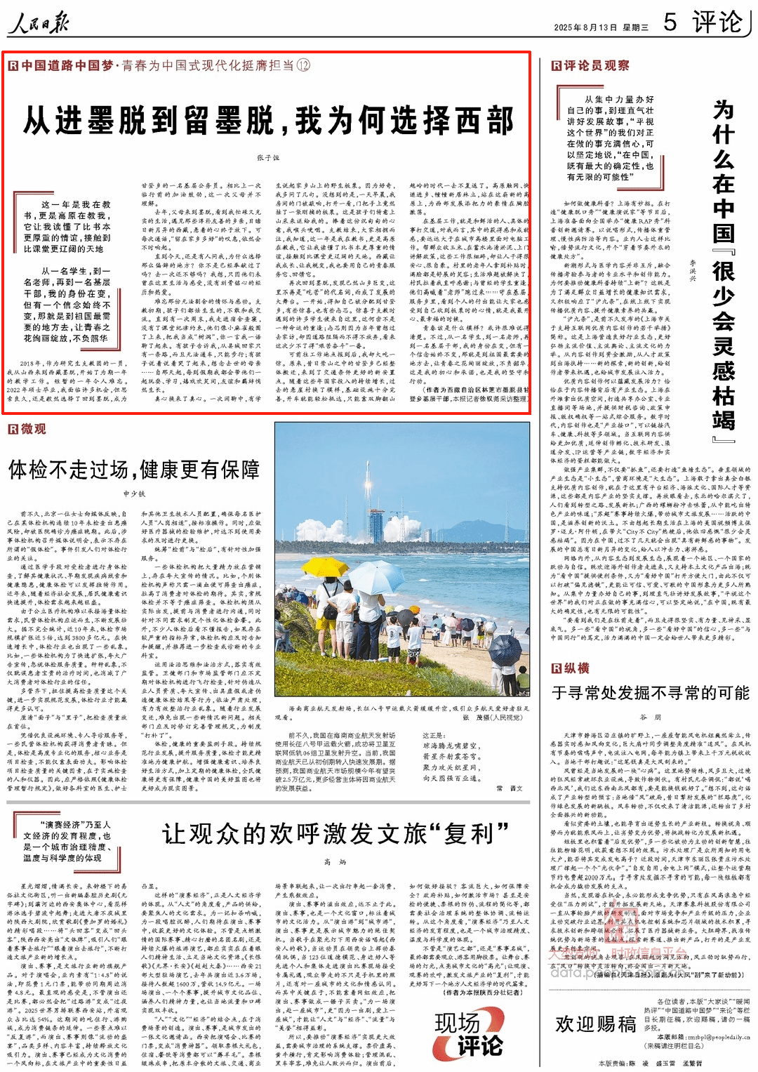 8月13日,《人民日报》以《从进墨脱到留墨脱,我为何选择西部》为题,报道了成人自拍