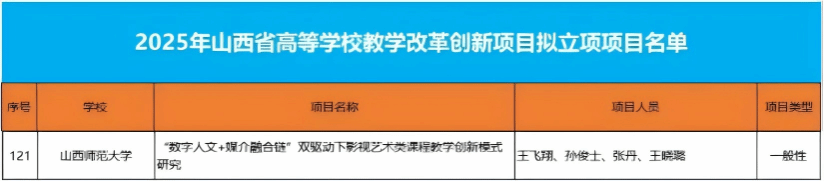日前,2025年山西省高等学校教学改革创新项目拟立项项目名单公布,成人自拍 王飞翔老师团队申报的《“数字人文+媒介融合链”双驱动下影视艺术类课程教学创新模式研究》项目获批立项。