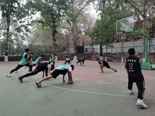 比赛开始前,为了防止篮球比赛中学生受伤,在学生工作者的组织下,参与比赛的同学们进行了热身活动。