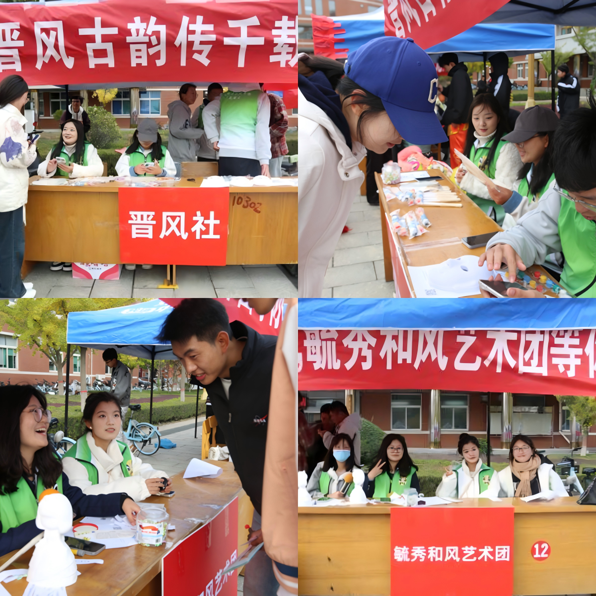 晋风社、毓秀和风艺术团于2024年10月19、20两日,在校园内书香广场举办社团纳新活动。一场别开生面社团招新活动在校园内精彩上演,为学子们开启了一扇通往艺术殿堂的大门。青年有戏,晋风传承。晋风社用戏曲知识问答的方式,发扬戏曲文化,通过绘制脸谱、折扇,欣赏艺术之美。而在毓秀和风艺术团中,则有悠扬歌曲萦绕,有古诗之韵相承,还有可爱的石膏娃娃相伴。百团大战,如同一幅绚丽多彩的画卷,展现了大学生们的青春活力和无限创造力。在充满热情的校园里,同学们将在社团的舞台上绽放自己的光彩,书写属于自己的青春篇章。此次活动不仅为社团注入了新活力,也在同学之间里掀起了一股戏曲热潮。在未来的日子里,新成员将在社团中绽放光彩,共同传承和弘扬中华民族的优秀传统文化,让戏曲艺术在校园中绽放出更加绚烂的花朵。