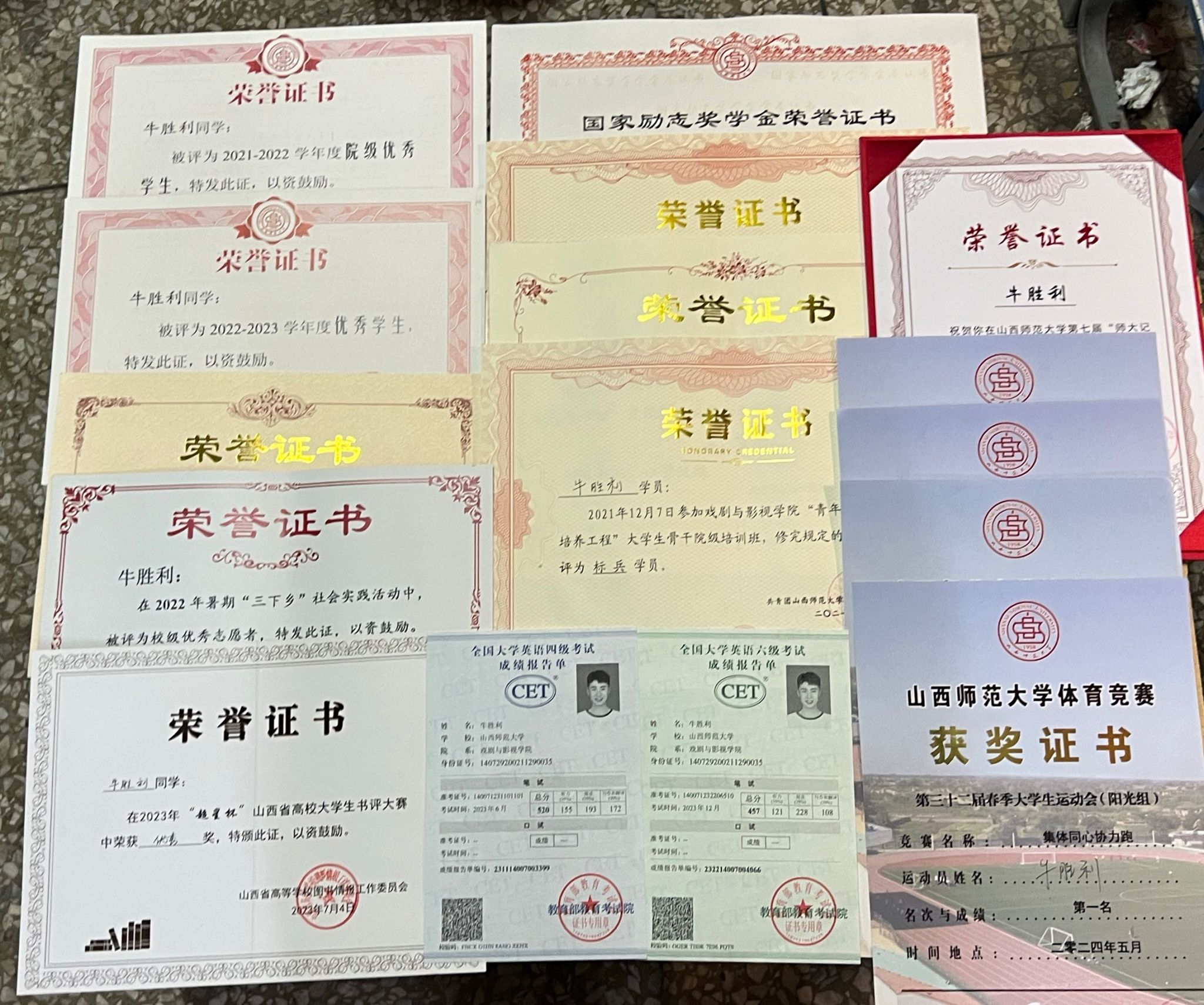 牛胜利,21级戏剧影视文学专业学生,推免至东北大学艺术学院。本科阶段积极参与各类科研项目和课外活动,获得奖项有: