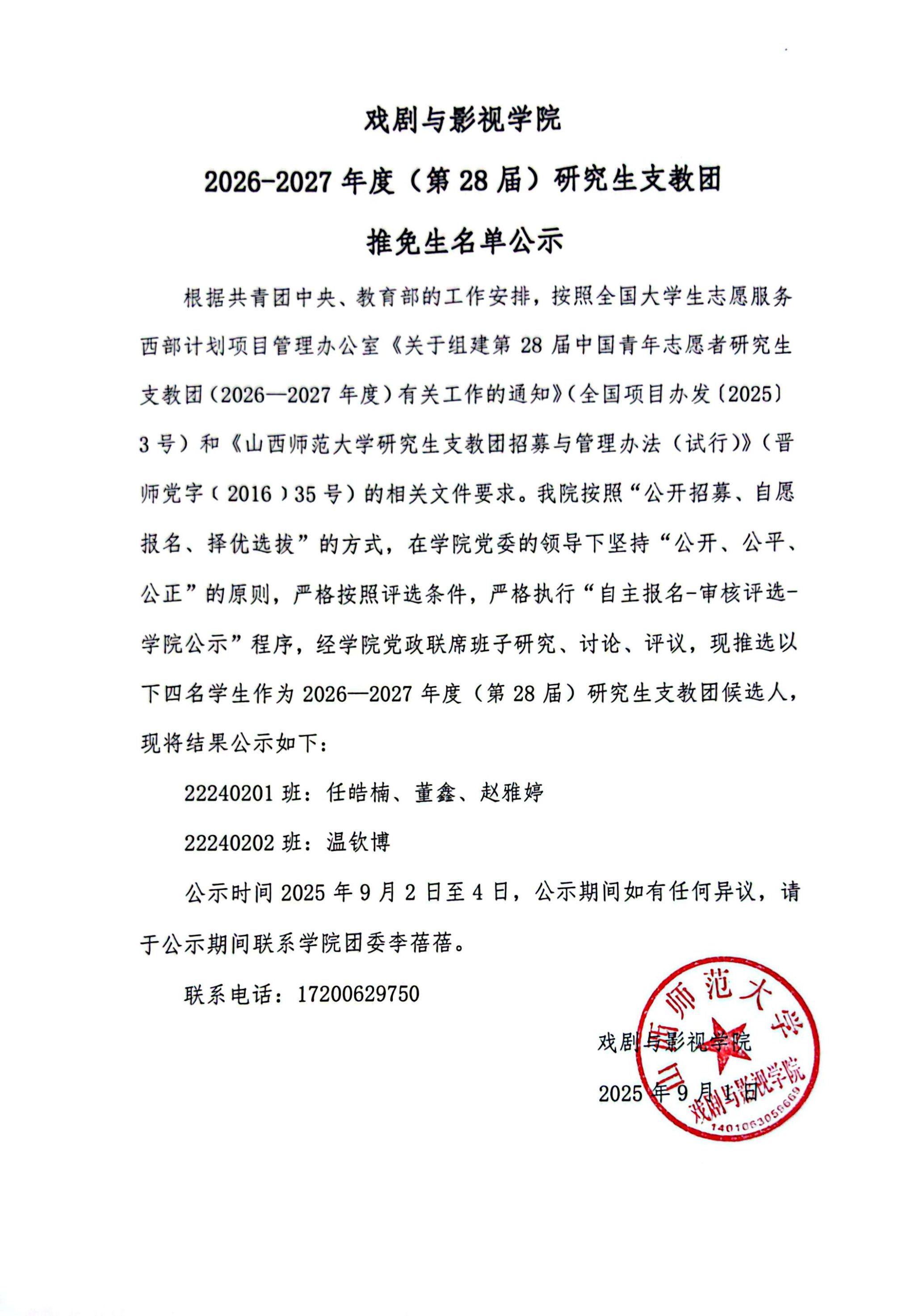 成人自拍 2026-2027年度(第28届)研究生支教团 推免生名单公示