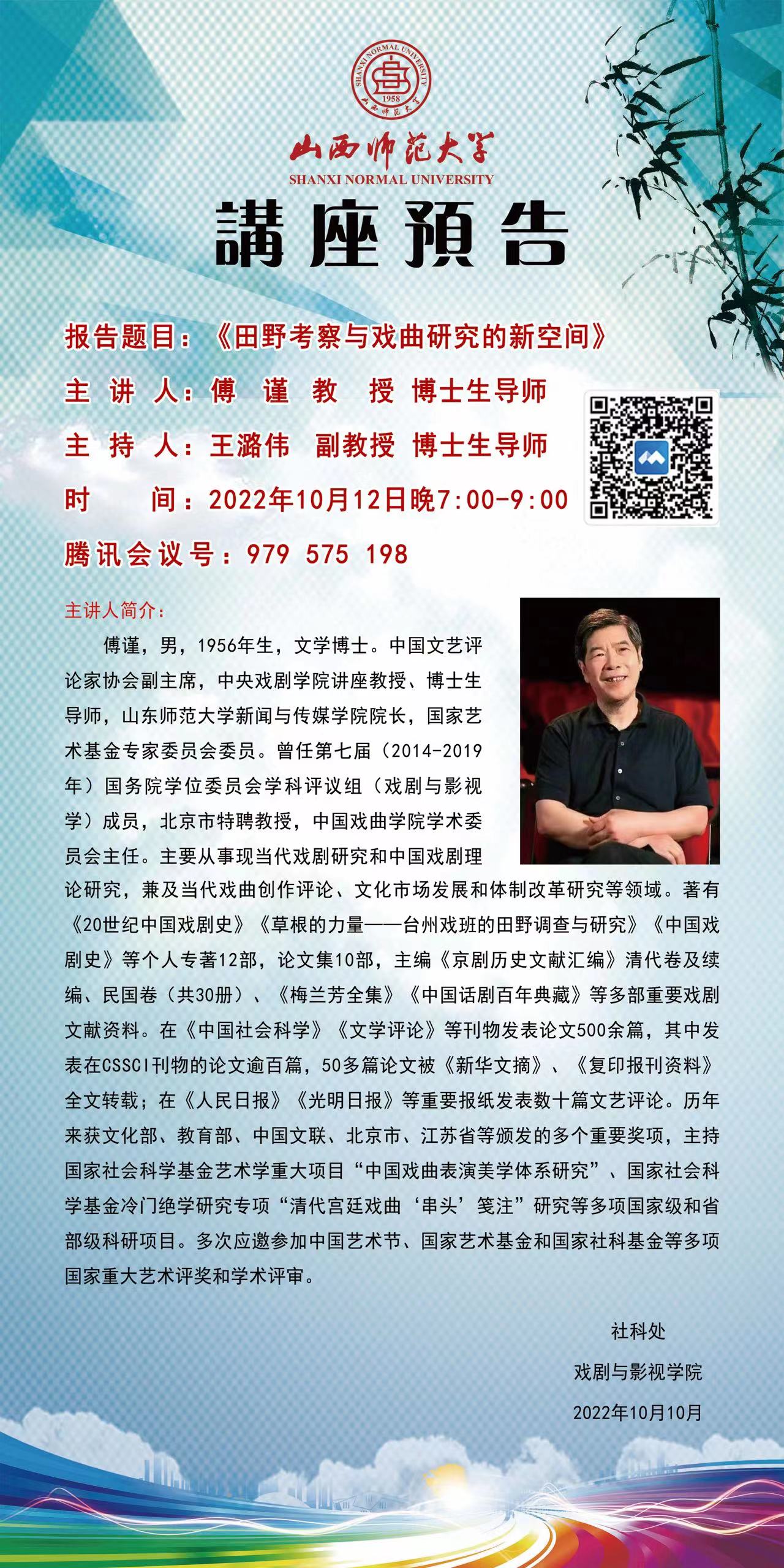 讲座预告:《田野考察与戏曲研究的新空间》 主讲人:傅谨教授