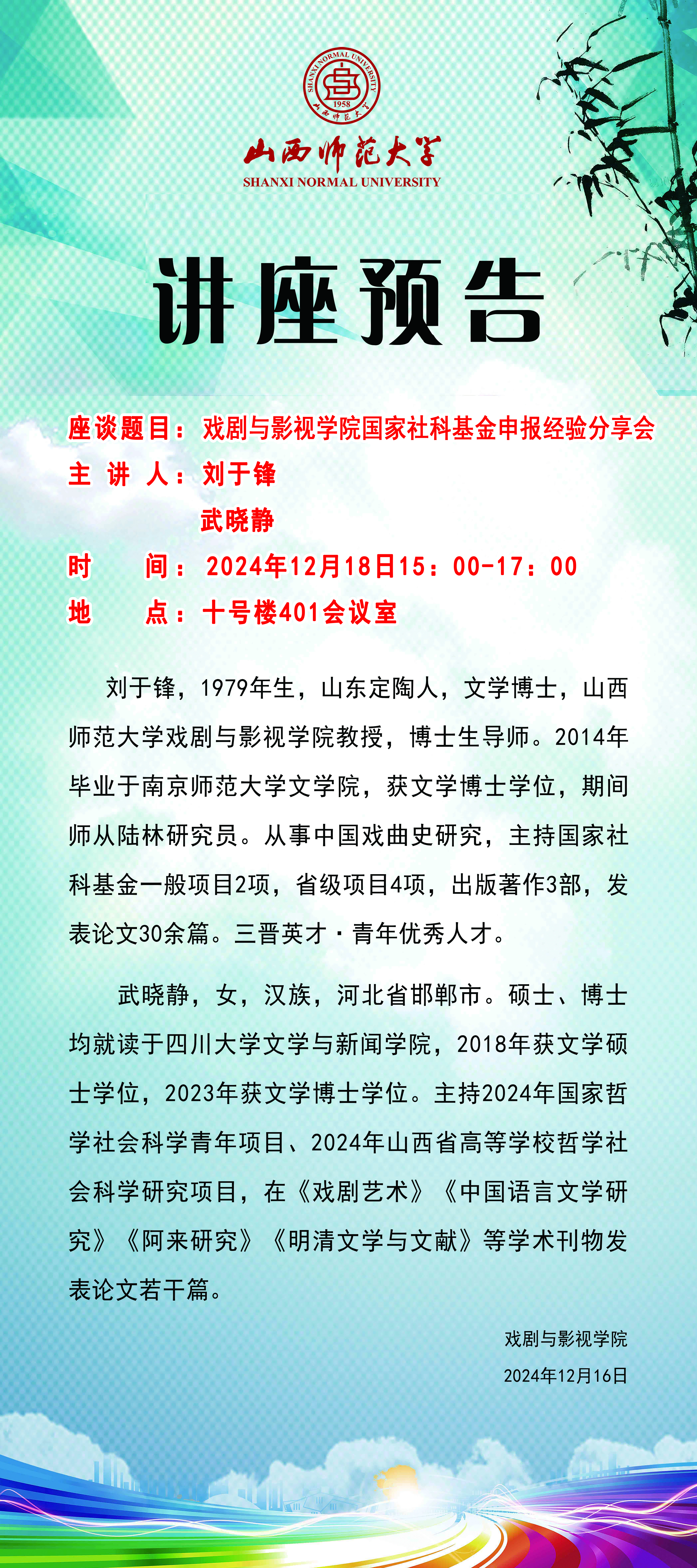 成人自拍 拟于12月18日(周三)15:00-17:00在南区10号楼401会议室举办《成人自拍 国家社科基金申报经验分享会》,主讲人为刘于锋教授、武晓静老师。