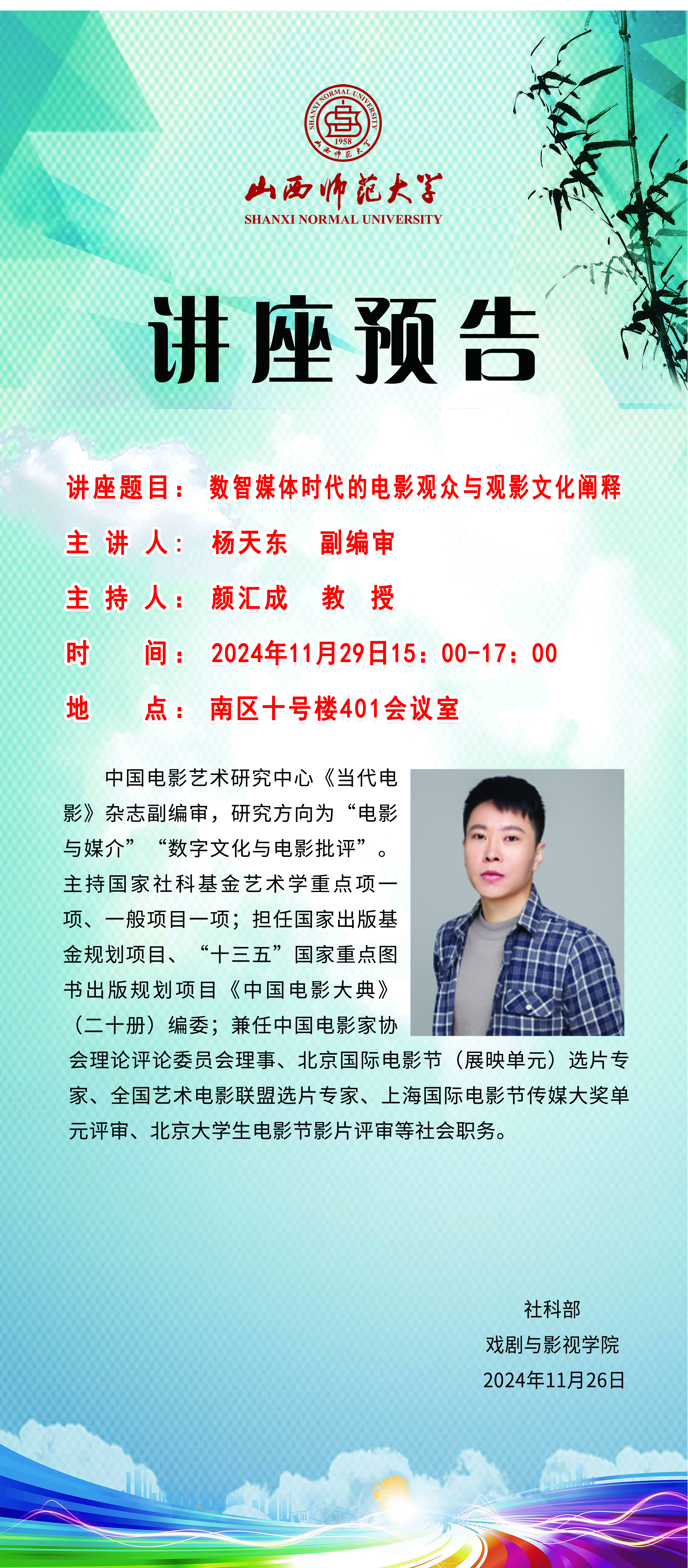 成人自拍 拟于11月29日(周五)15:00-17:00在南区10号楼401会议室举办《数智媒体时代的电影观众与观影文化阐释》讲座,主讲人为杨天东副编审,本次讲座由副院长颜汇成教授主持。