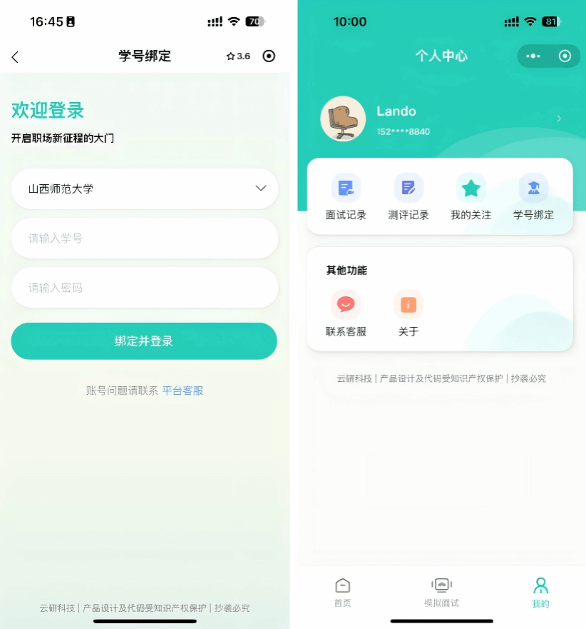 ”,输入学号、密码为身份号后六位,绑定并登录,你的个性化面试之旅即将开启!